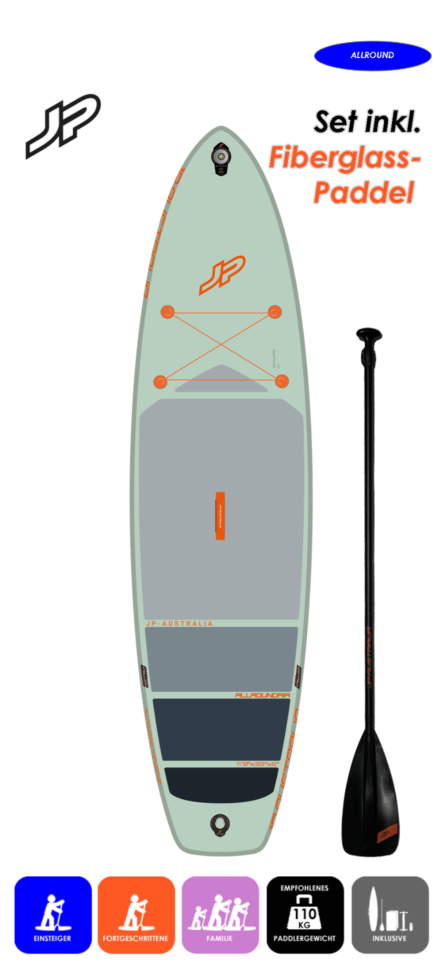 Lieferumfang: Tragerucksack mit komfortablen Trägern, Doppelhubpumpe, Finne, Repairset und dreiteiligen Fiberglass-Paddel.
