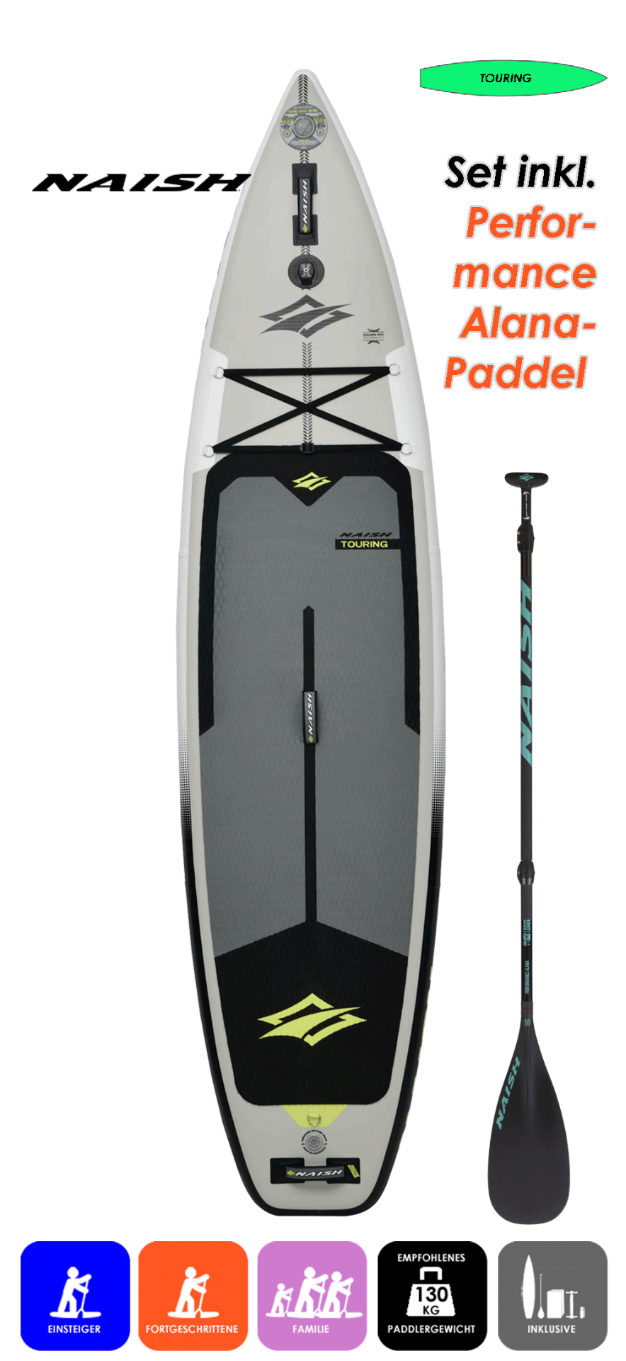 Set inklusive NAISH Performance Alana 80 RDS 3Pcs. Paddel im Wert von 229€.
