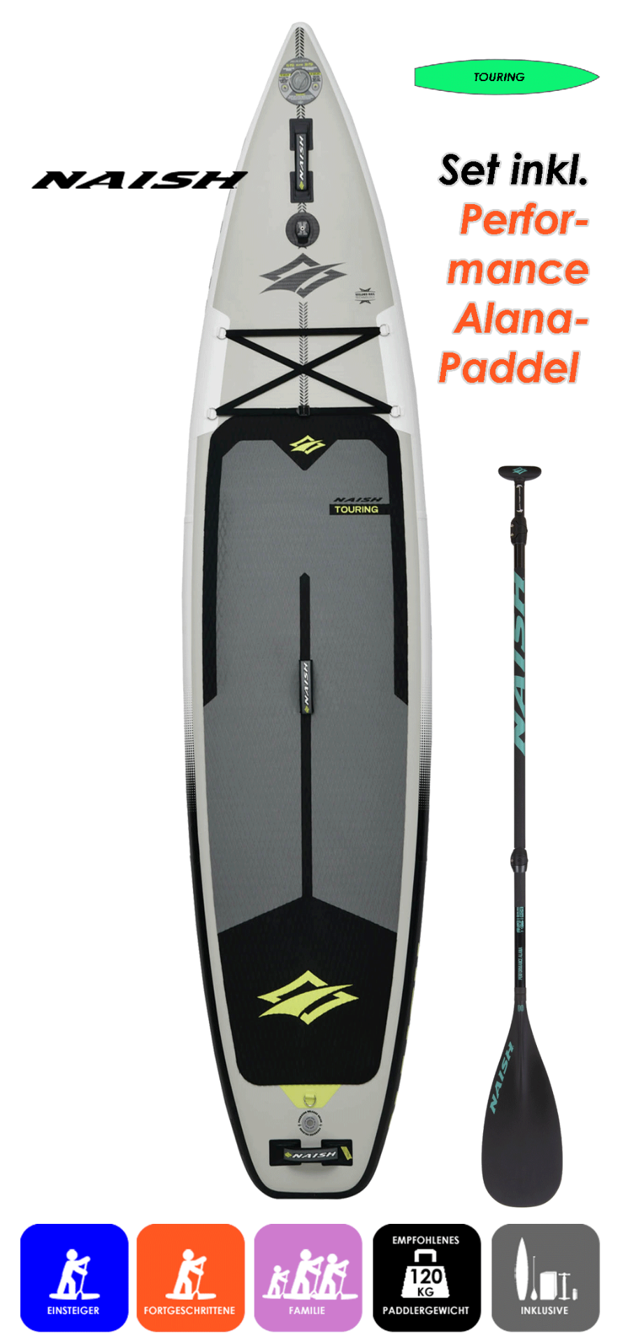 Set inklusive NAISH Performance Alana 80 RDS 3Pcs. Paddel im Wert von 229€