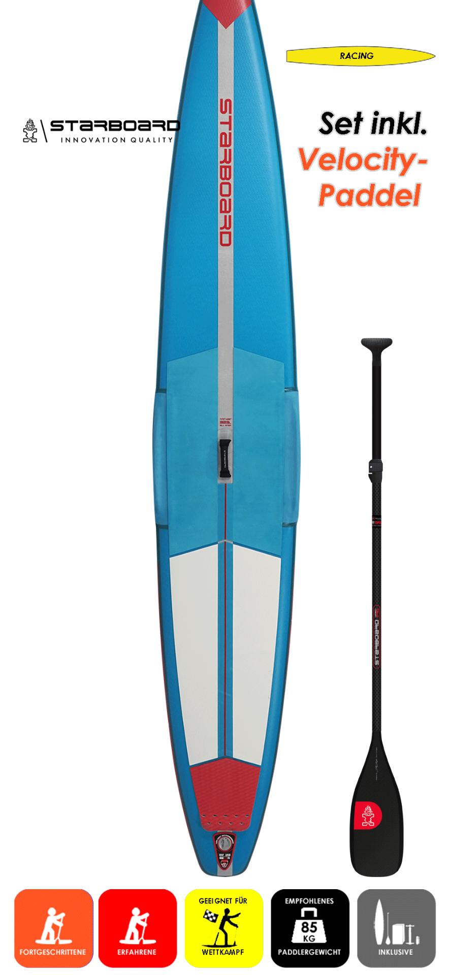 Lieferumfang: Big-Trolleybag, Hochdruckpumpe, Leash, US-Finne und Velocity 88 2Pcs. Paddel im Wert von 540,-.