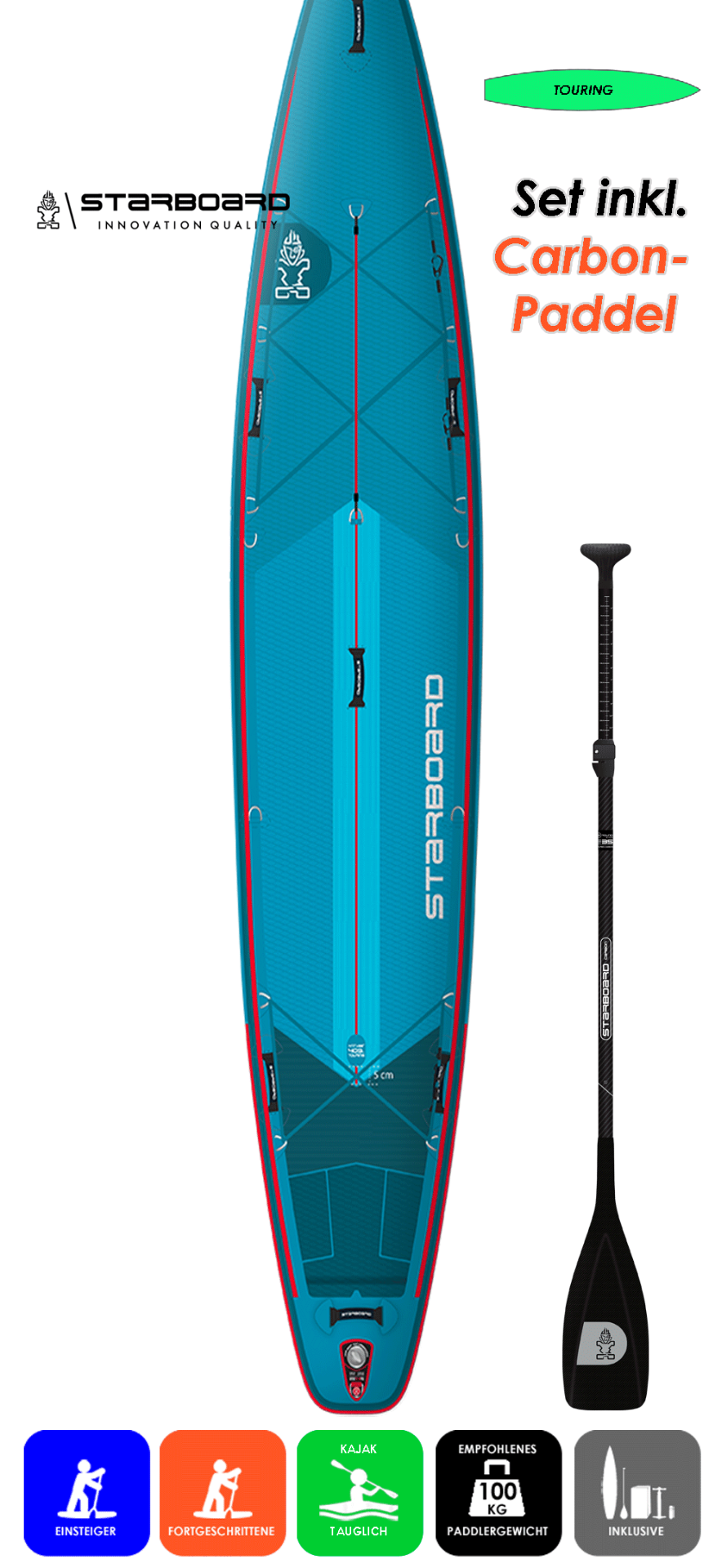 Bislang nur in deutlich kostenintensiverer Version erhältlich, ist nun erstmalig das flotte Touringshape in Deluxe Lite Bauweise erhältlich. Die Touring S-Linie ist für größere Paddler bis zu 100 kg gedacht und eignet sich hervorragend, für deine Erkundungstouren mit Gepäck. Die durch die breite Outline gewonnene Stabilität und das Volumen beeinträchtigen nicht die Gleitfähigkeit des Boards und machen es zu Deiner bevorzugte Wahl für Erkundungen.