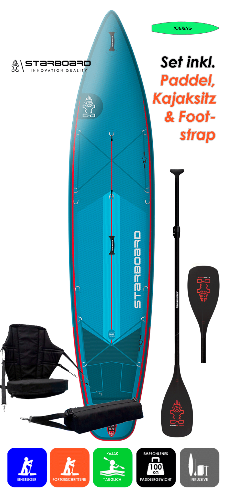 Als reines Touringboard bezeichnet, ist es gemäß unserer Definition nicht korrekt. Aufgrund des kleinen Shapes - kurze Länge bis 350cm, sowie der geringen Breite, die mitunter eher dem Race-Segment zugeordnet werden kann - handelt es sich um einen Sports-Tourer. Geeignet und empfohlen, für all diejenigen etwas zügigeres zum Allrounder suchen, und nicht gleich ins Race-Segment übergehen möchten. Kompaktheit und Schnelligkeit in Konvergenz, das zeichnet dieses Klasse aus. Und darum sind diese besonders beliebt bei sportlich Ambitionierten, als auch bei Kids und Teens, denen die Allrounder schlichtweg zu lahm und langweilig sind. So ist auch dauerhaft Spaß bei gleichzeitiger Sportlichkeit gewährleistet. Selbstverständlich ist die Kajakoption gegeben, sowie eine Hydro Slick Edge für optimalen Strömungsabriss am Tail.